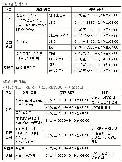안내 NH농협카드 및 KB국민카드 서비스 일시 중단 안내(추석 연휴 기간)